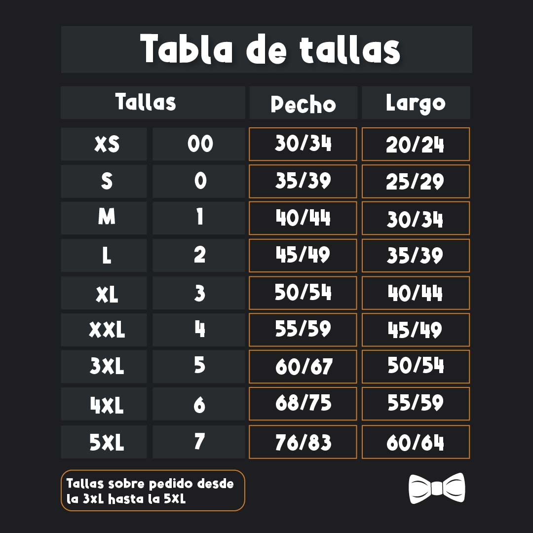 - TODAS LAS TALLAS. Manejamos todas las tallas, también podemos fabricar tallas especiales para que todas tus mascotas luzcan fabulosas.